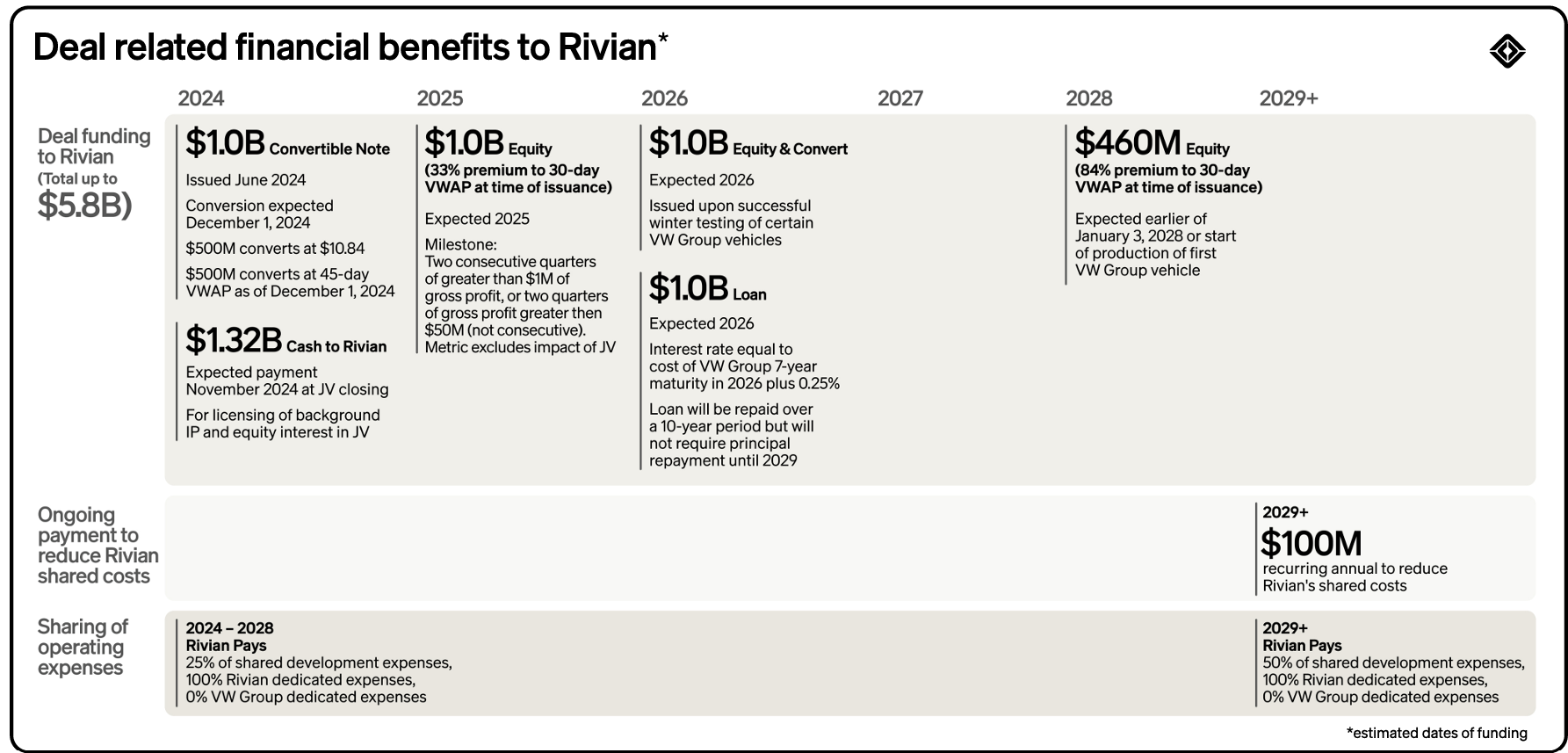 2) An 84pc premium over the 30-day VWAP on a $460mn investment into Rivian equity at the earlier of January 2028 or first production of a saleable Volkswagen vehicle using the JV’s technology.