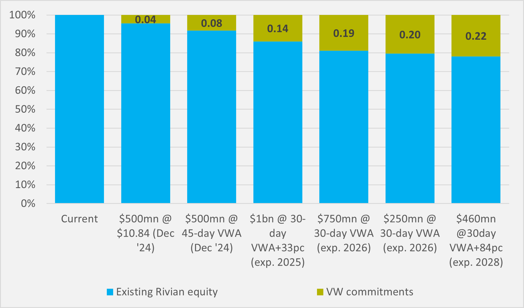 While any resumption of a Rivian stock rally could bring the 45-day VWAP slightly higher, the additional $500mn due next month looks set to equate to another 4pc stake. The $1bn expected in 2025 would, again at current share price levels, bring VW’s stake up by another six percentage points to 14pc, while the two 2026 additions of a combined $1bn would further bolster that figure to 20pc.