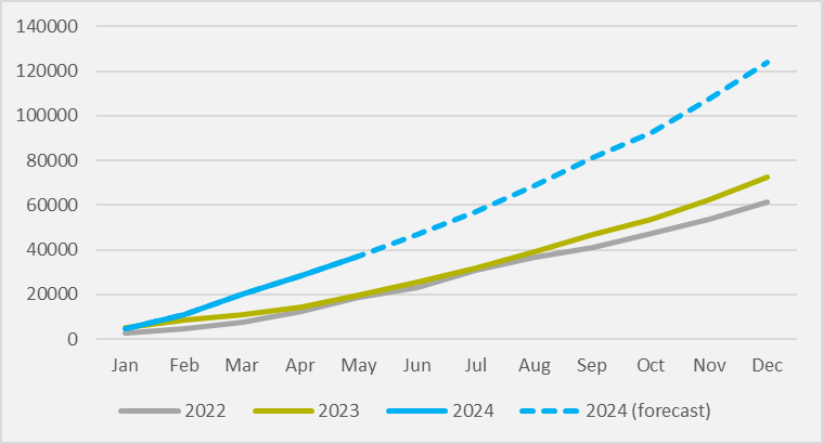 May trails only March and December of last year in terms of absolute EV deliveries, which sees Ford's year-to-date US all-electric sales up by 88pc compared to 2023 (see Fig.1).