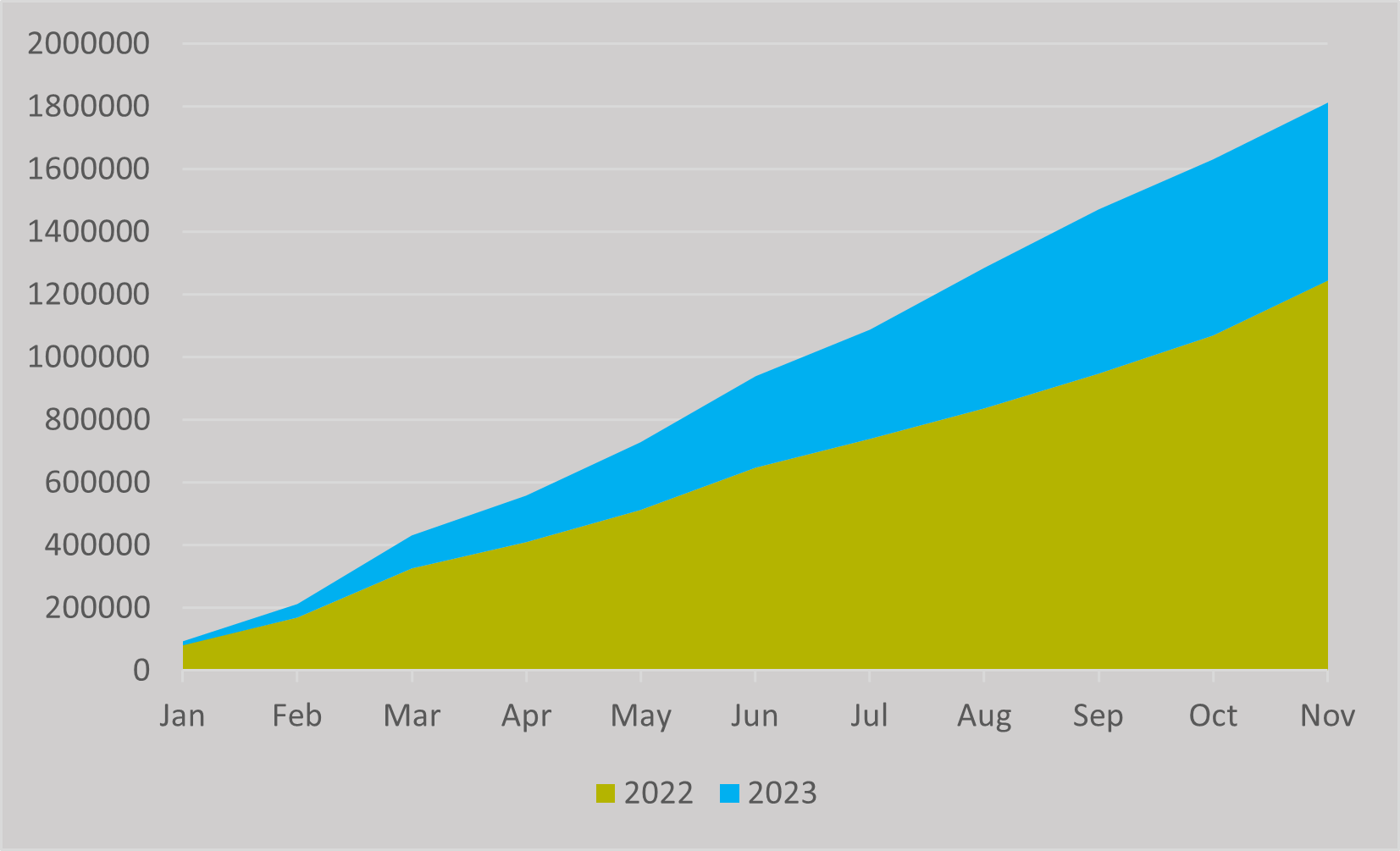 And all that saw November BEV sales for the 31-country EU+Efta+UK bloc hit almost 183,000, up by c.8,500 compared to November 2022. For the first 11 months of the year, the bloc has now seen new BEV sales of over 1.8mn, a rise of 570,000 compared to the same period last year (see Fig.1).