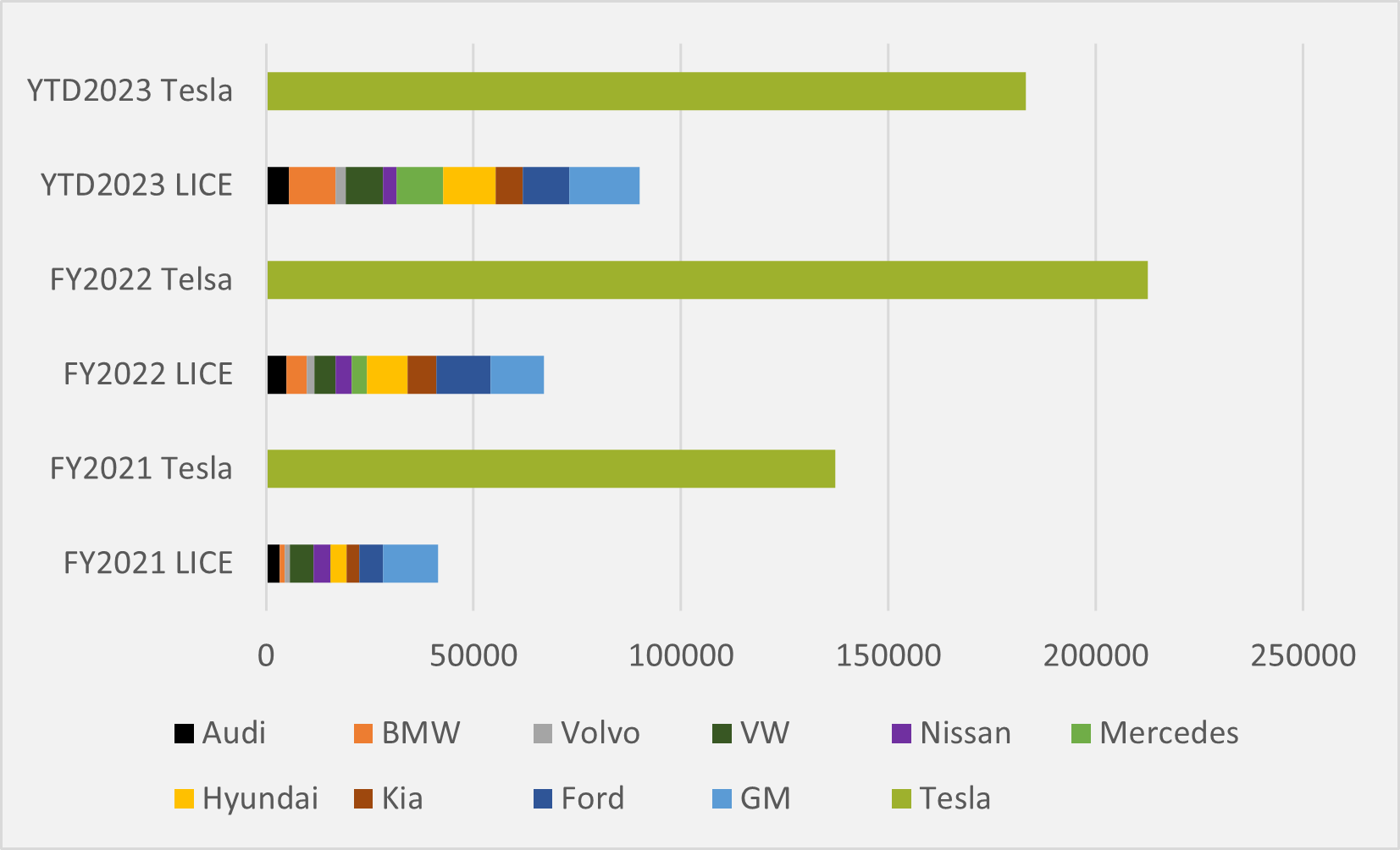 German OEMs have made big strides in conquering California BEV market share. BMW has already racked up sales 130.9pc above what it achieved across last year. And peer Mercedes has eclipsed its FY’22 figure by 212.7pc.