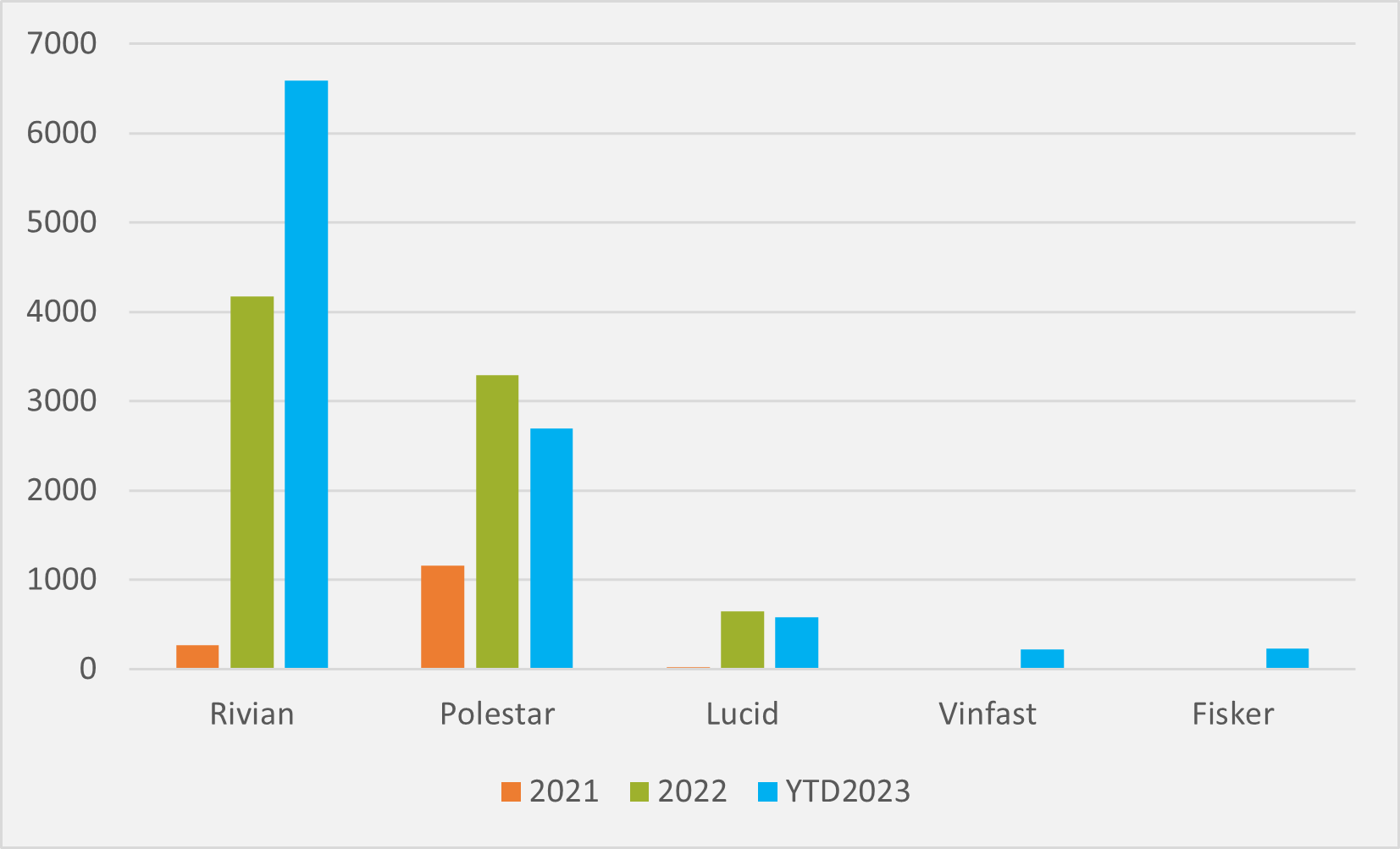 Sales by pure plays have captured 3.5pc of BEV market share in the state this year, compared to 2.8pc for all of 2022 — mostly down to a significant jump in Rivian sales. While Fisker and Vinfast’s sales numbers are modest, they do add greater breadth to the pure play market. Currently, though, Sweden’s Polestar and US firm Lucid have yet to match FY’22 sales in 2023 thus far.