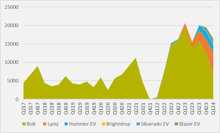 Detroit legacy manufacturer GM sold 16,425 BEVs in North America in the fist quarter, amounting to a 21pc year-on-year decline, with only 2.8pc of GM's overall sales being BEVs.