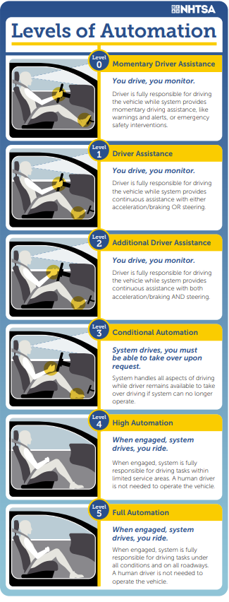 To add even greater complexity to the debate, the SAE definitions are not the only show in town. For example, the US' Department of Transport's National Highway Traffic Safety Administration (NHSTA) takes a similar level-based approach, but with what one AD expert describes as a "nuance of difference in their explanation".