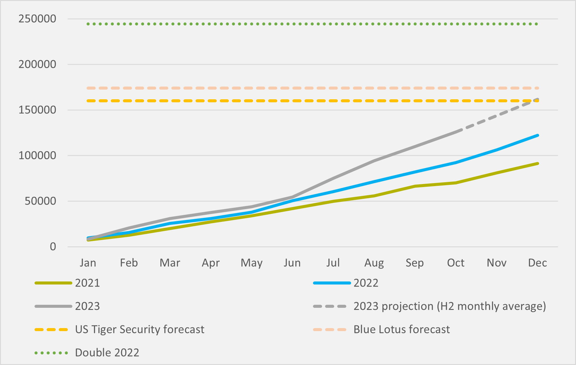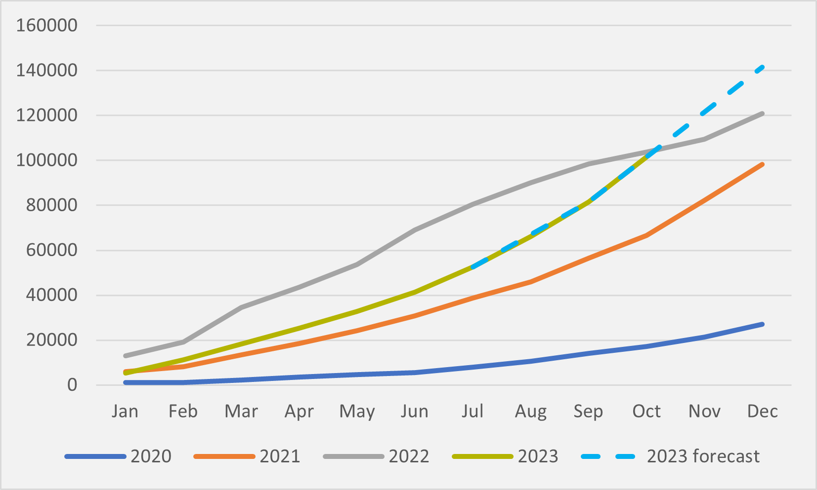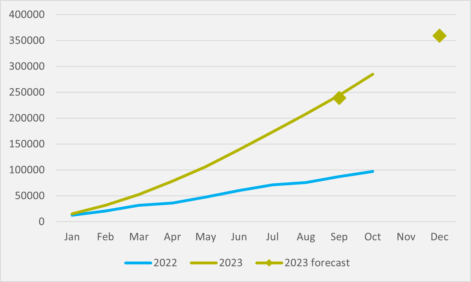 At that point, over the first seven months of the year, Xpeng’s cumulative sales were lagging 2022’s figures by some 28,000. But after coming in right in the middle of forecast range for Q3, recording a best quarter since Q4’21, it has now narrowed that year-on-year gap to just 2,200 (see Fig.4). Given how closely it has tracked August’s forecast, it seems reasonable to suggest that Xpeng’s sales performance may well exceed last year for 2023 as a whole.