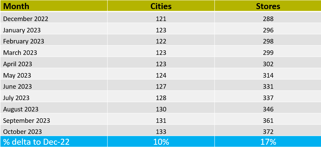 Cumulative deliveries of the L8 and L9 have each surpassed 100,000 units, he reports. Li’s cumulative deliveries for 2023 thus far are at almost 285,000, compared to under 100,000 sales in the first ten months of last year. The firm’s geographical reach also continues to expand, up to 372 stores in 132 Chinese cities bye the end of October (see Fig.1).