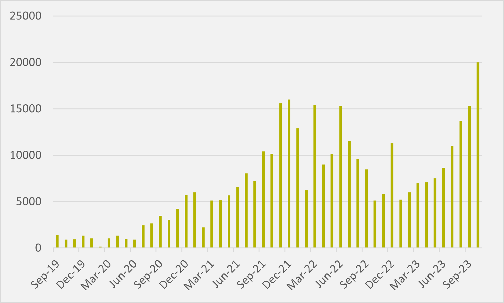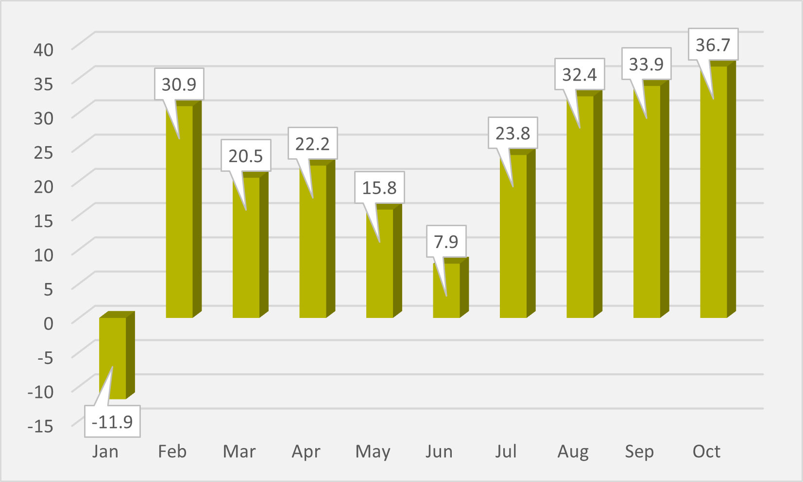 The October deliveries consisted of 11,086 premium smart electric SUVs, and 4,988 premium smart electric sedans. For a third consecutive month, sales were up by more than 30pc year-on-year (see Fig.6).