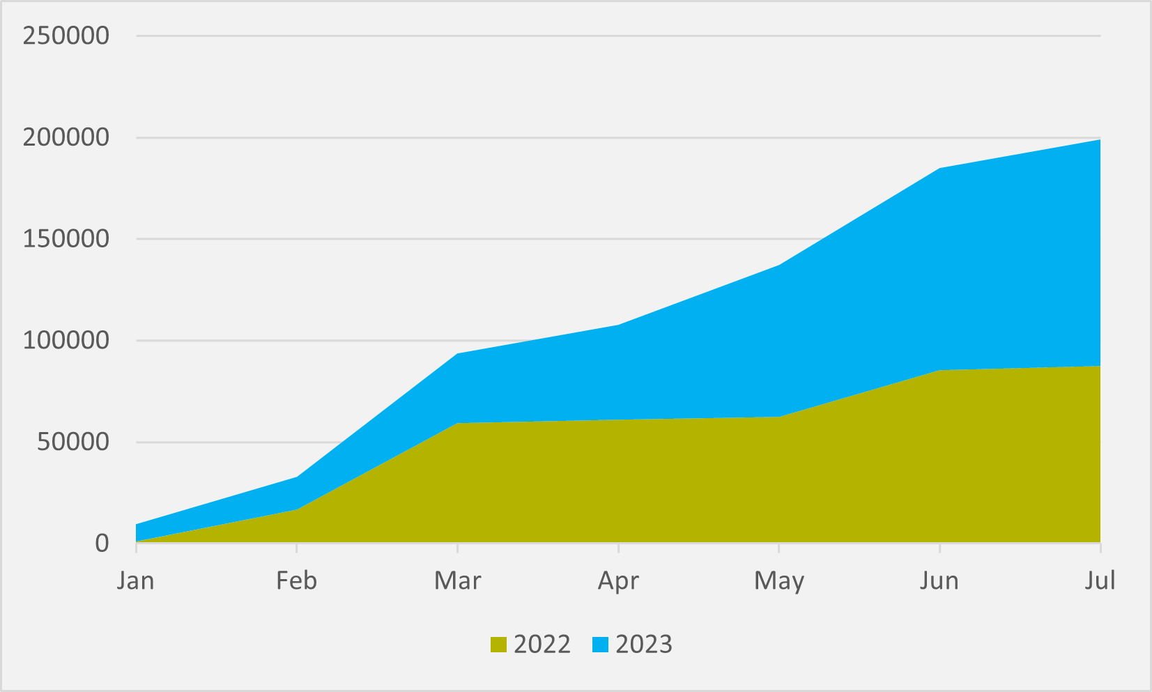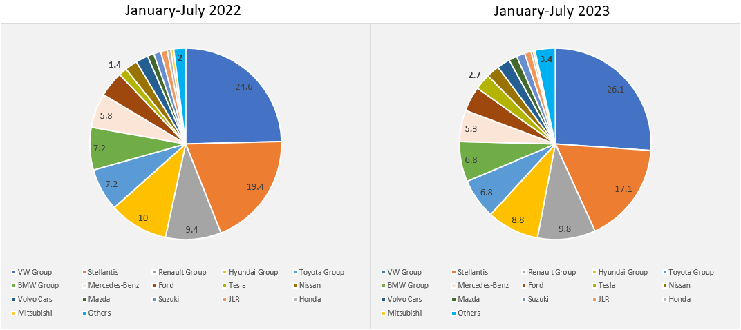 Tesla has also played a major role in reducing the sizes of other OEM’s slices of the European pie. Its cumulative sales over the first seven month of the year have, according to Acea, reached almost 200,000, compared to less than 90,000 by the end of July 2022 (see Fig.2).