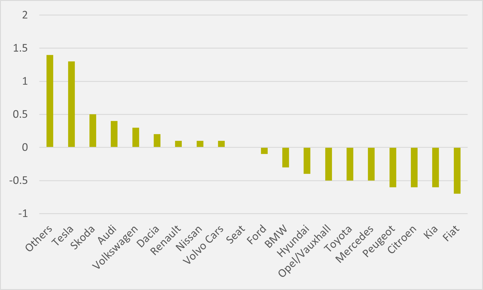 This has driven a 1.4 percentage point increase in its European market share, from 1pc to 2.4pc, propelling it past Nissan, Volvo, Japan’s Suzuki and Mazda and the UK’s JLR. And this growth by Tesla and by ‘others’ has made from grim reading for many other OEMs, with the aforementioned exception of VW and, to a lesser extent, France’s Renault Group.