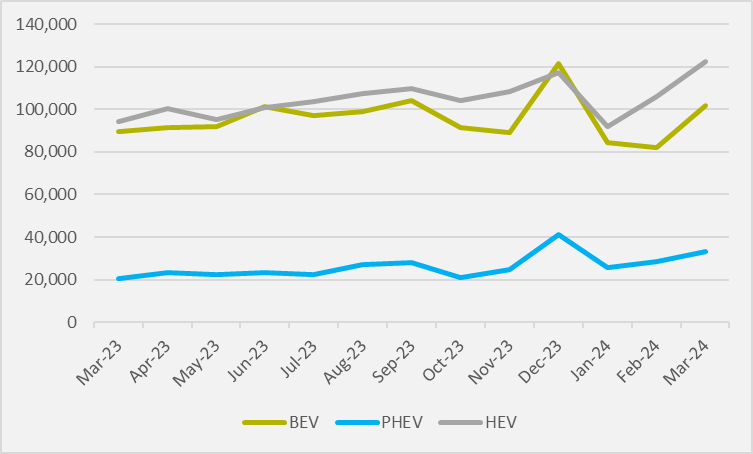 Seasonal trends mean that March is often a stronger month for the automotive industry than the two months preceding it. BEV sales in the first quarter of 2023, for example, increased by approximately 10,000 units each month between January and March. But month-on-month growth between February and March 2024 is just shy of 20,000 units, indicating that March was a strong month for BEVs even considering the expected seasonal jump.