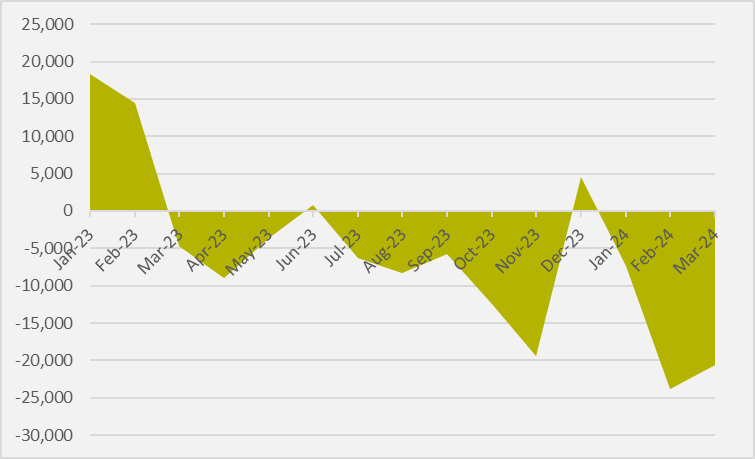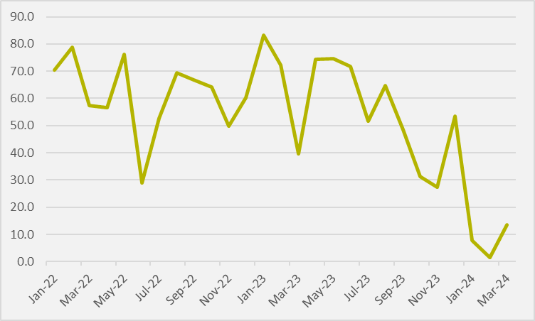 However, when viewed alongside the year-on-year growth seen across 2023, which routinely hit above 50pc, March's figures do not reverse what is markedly a slowdown in a broader context, despite being a material uptick compared to the beginning of 2024.